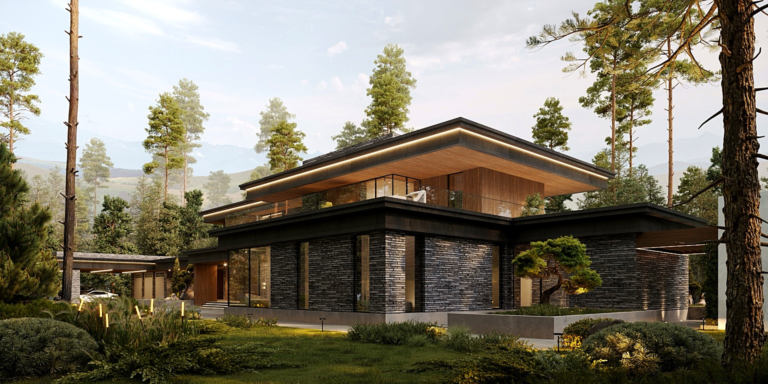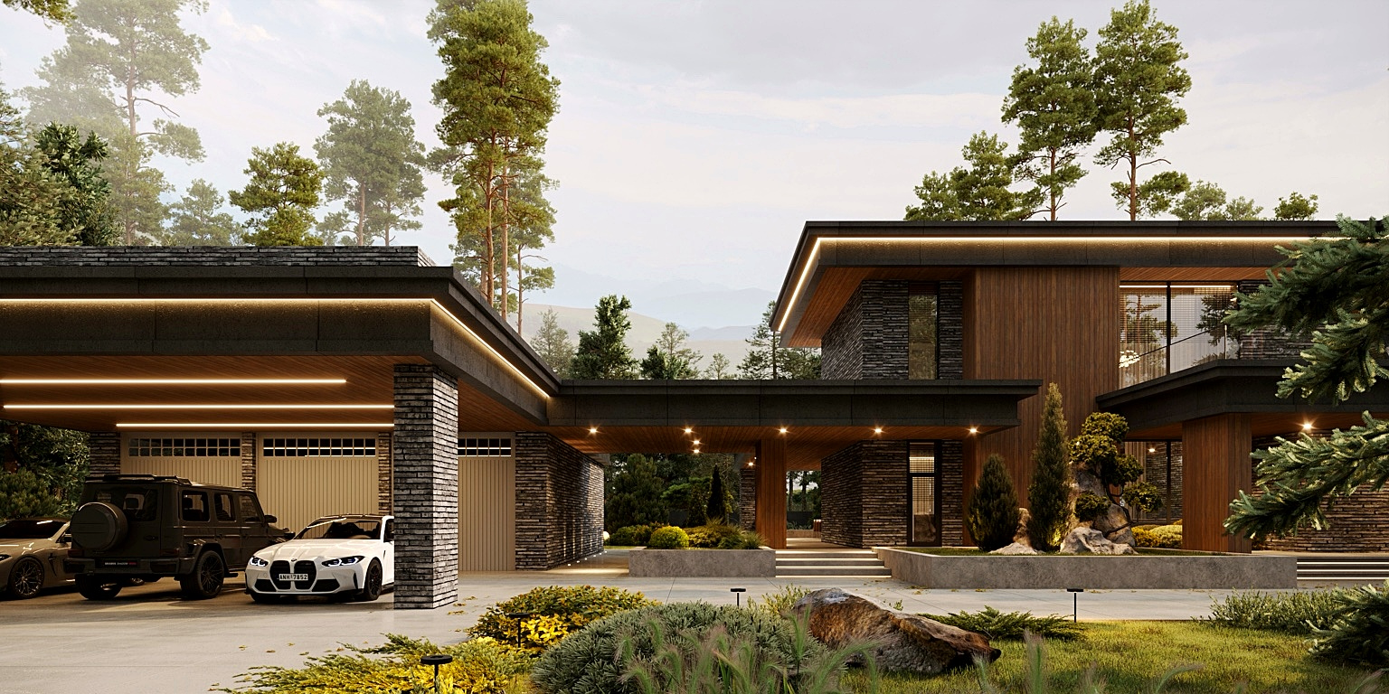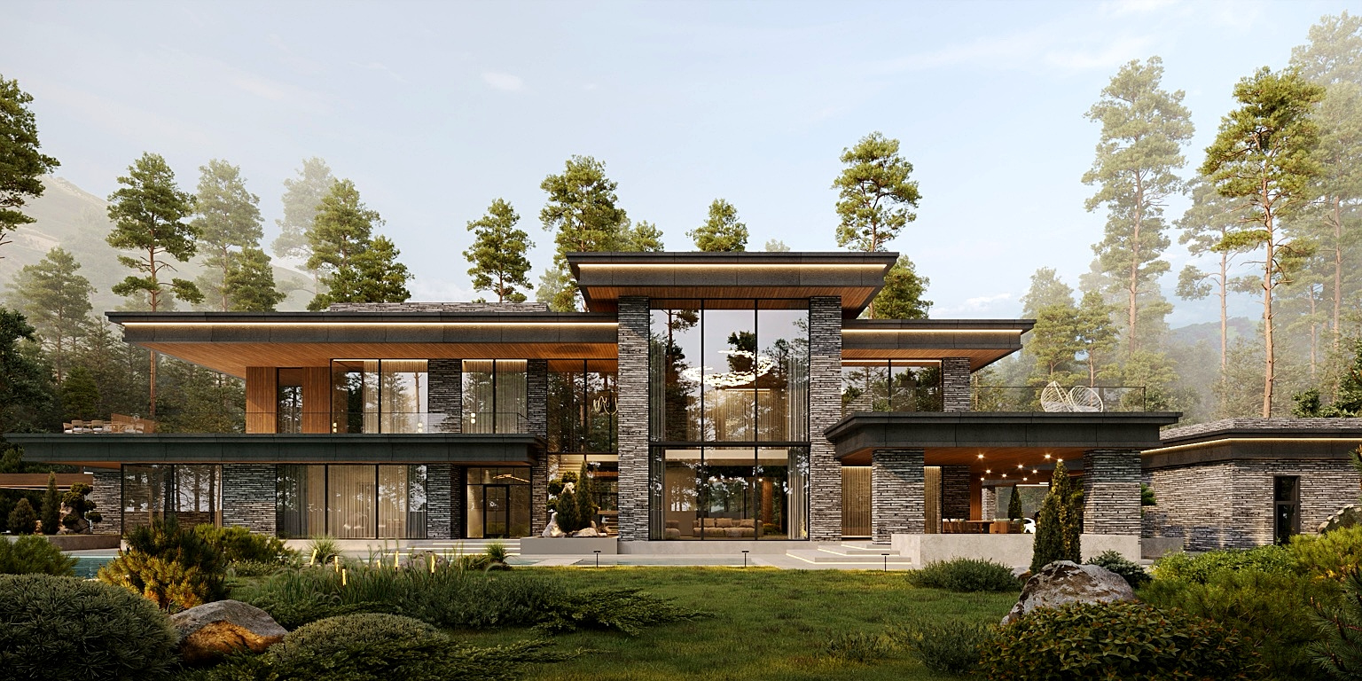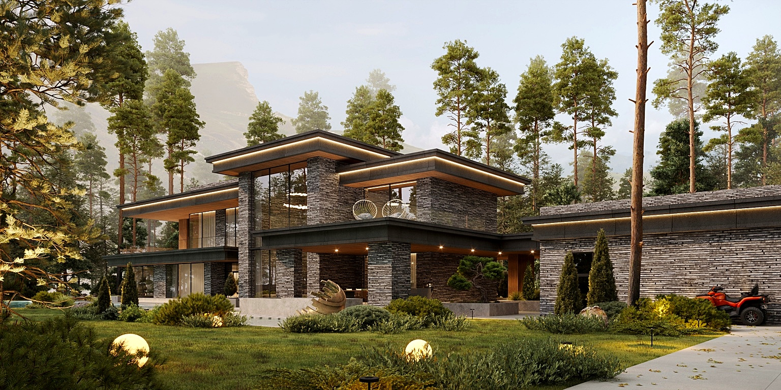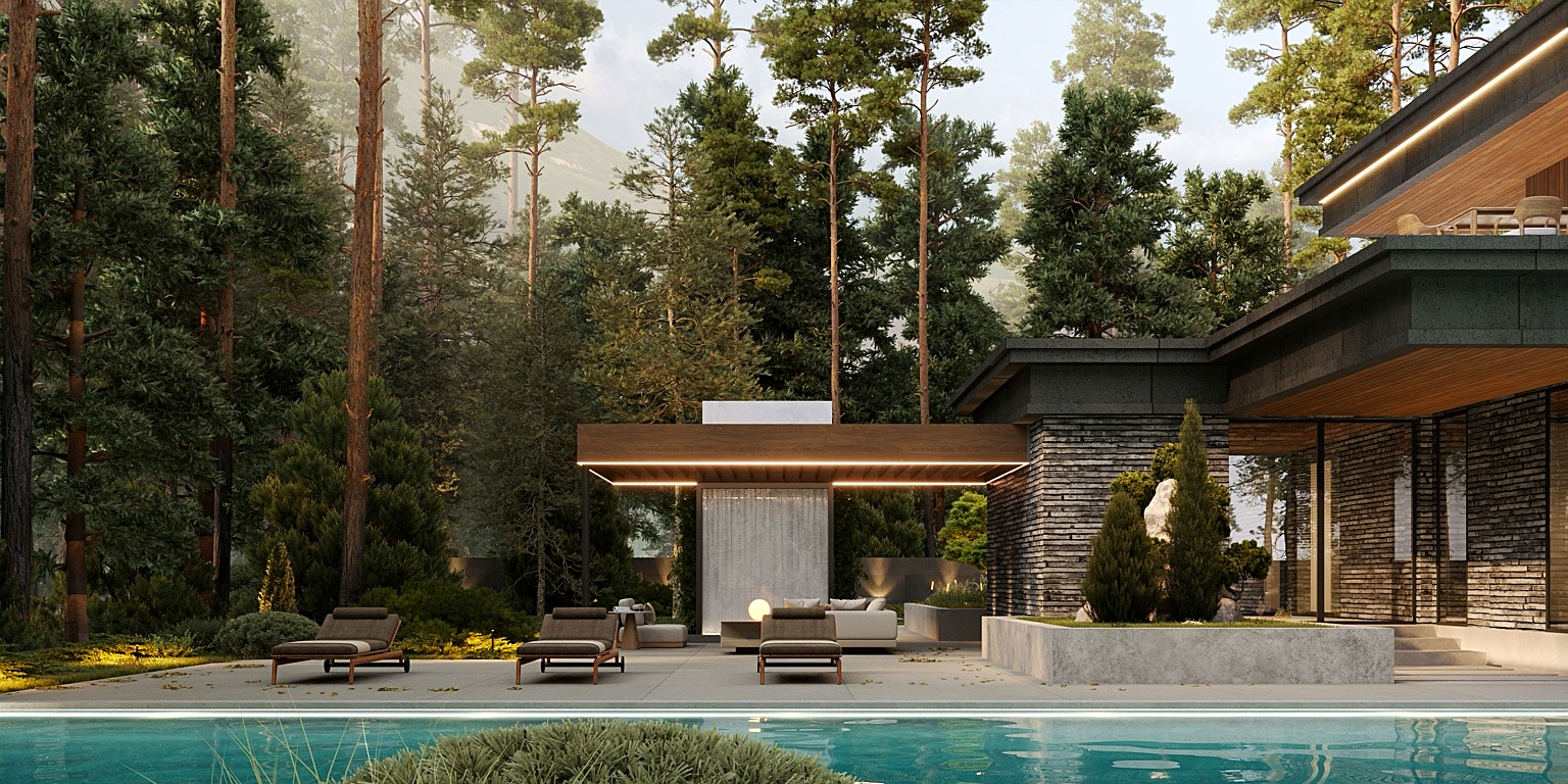 Интерьер и экстерьер словно перетекают друг в друга: панорамное остекление открывает виды на сосновый лес и горные вершины, наполняя пространство светом и воздухом. Каждое решение, от фактуры фасада до геометрии террасы, продумано для того, чтобы подчеркнуть естественную красоту окружающей природы.
