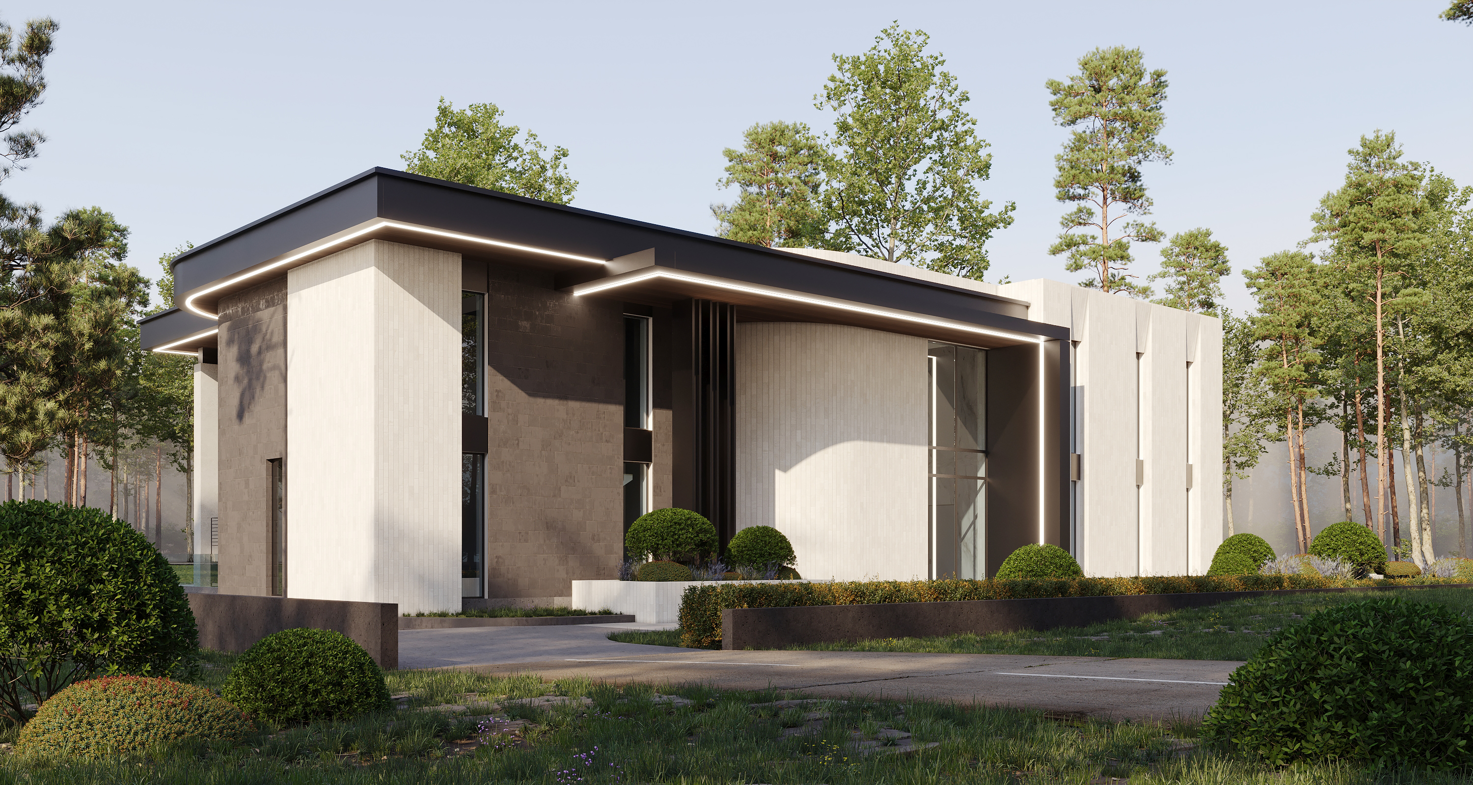 Фасад выполнен в сдержанной цветовой гамме: сочетание холодного серого камня, белых панелей и темных акцентов придает зданию утонченную элегантность. Благодаря стеклянным стенам интерьер буквально растворяется в ландшафте, позволяя природе стать частью архитектурного замысла.