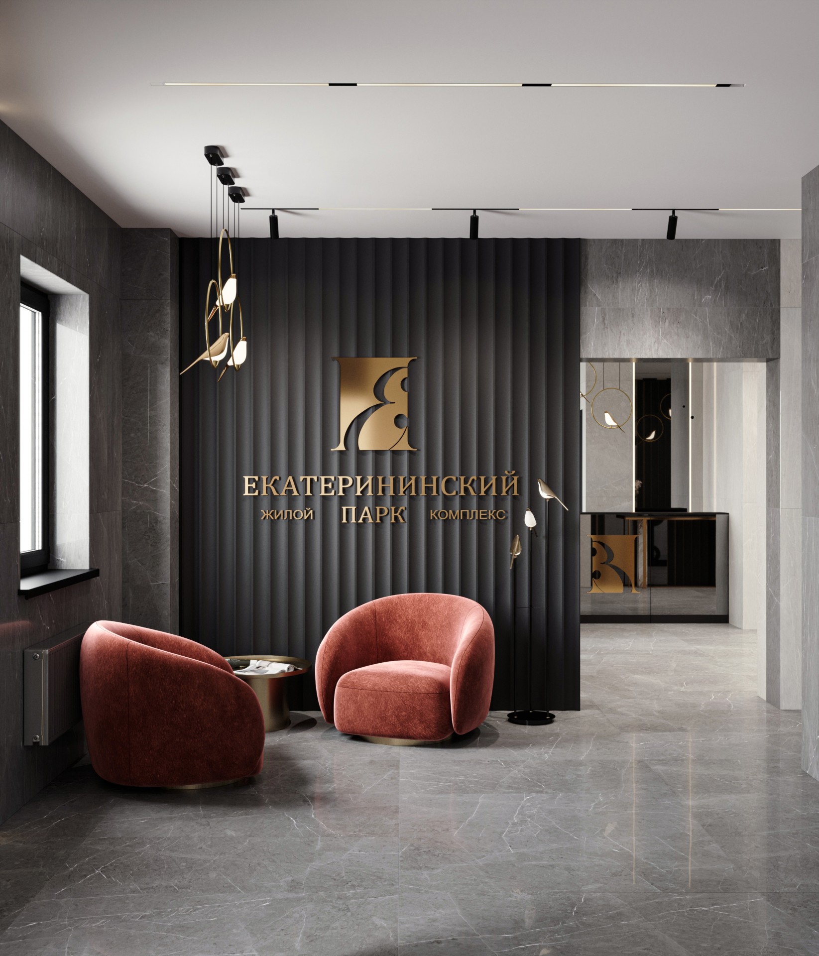 Особое внимание уделено зоне ресепшена, где установлены уникальные светильники в виде птиц. Они не только обеспечивают необходимое освещение, но и служат стильным декоративным элементом, добавляющим пространству легкости и элегантности. Этот элемент подчеркивает индивидуальность проекта и создает приятное первое впечатление.