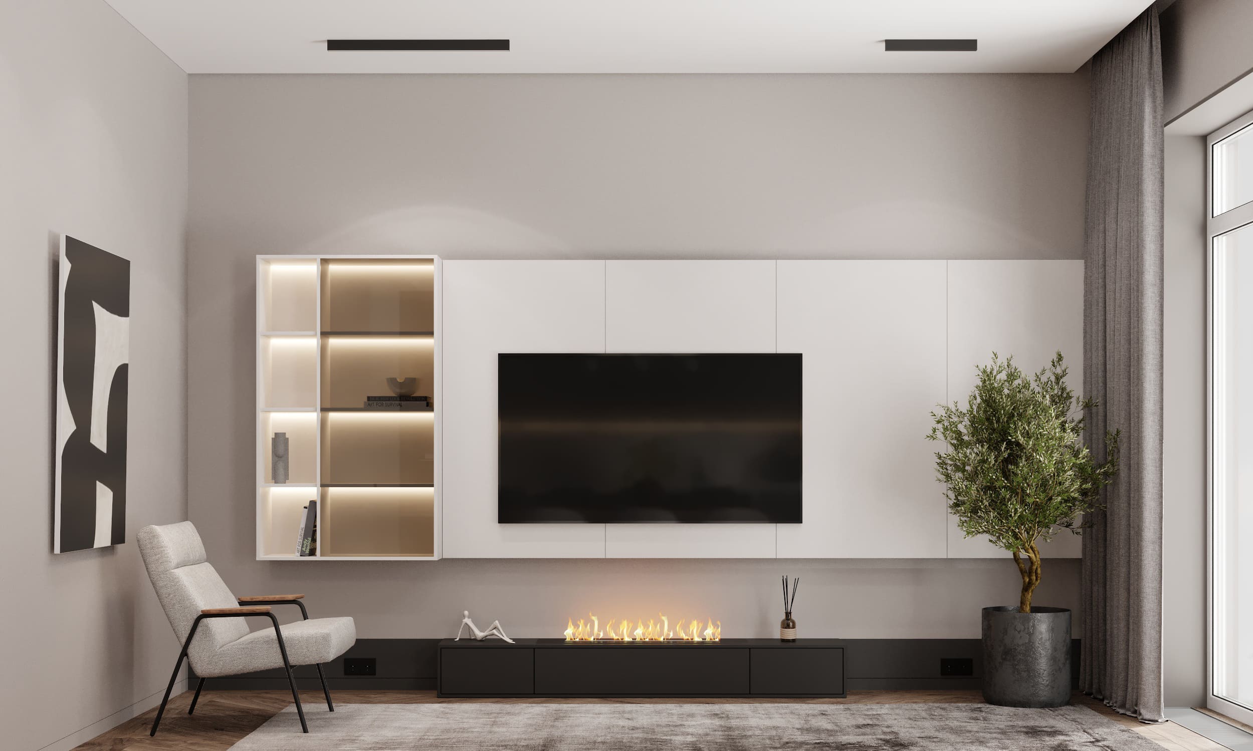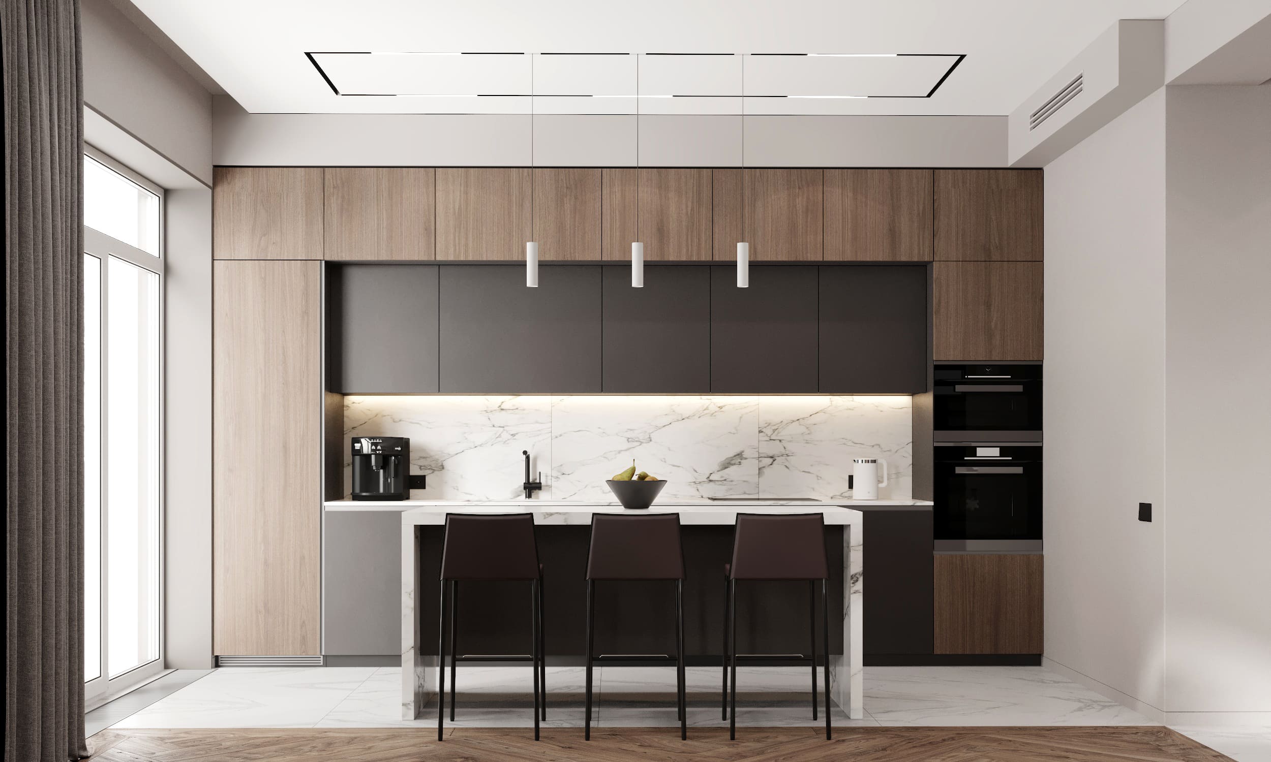 Пространство не хотелось загромождать ни цветом, ни тяжёлыми объёмами, поэтому все стены однотонно-светлые, а мебель спокойных оттенков.