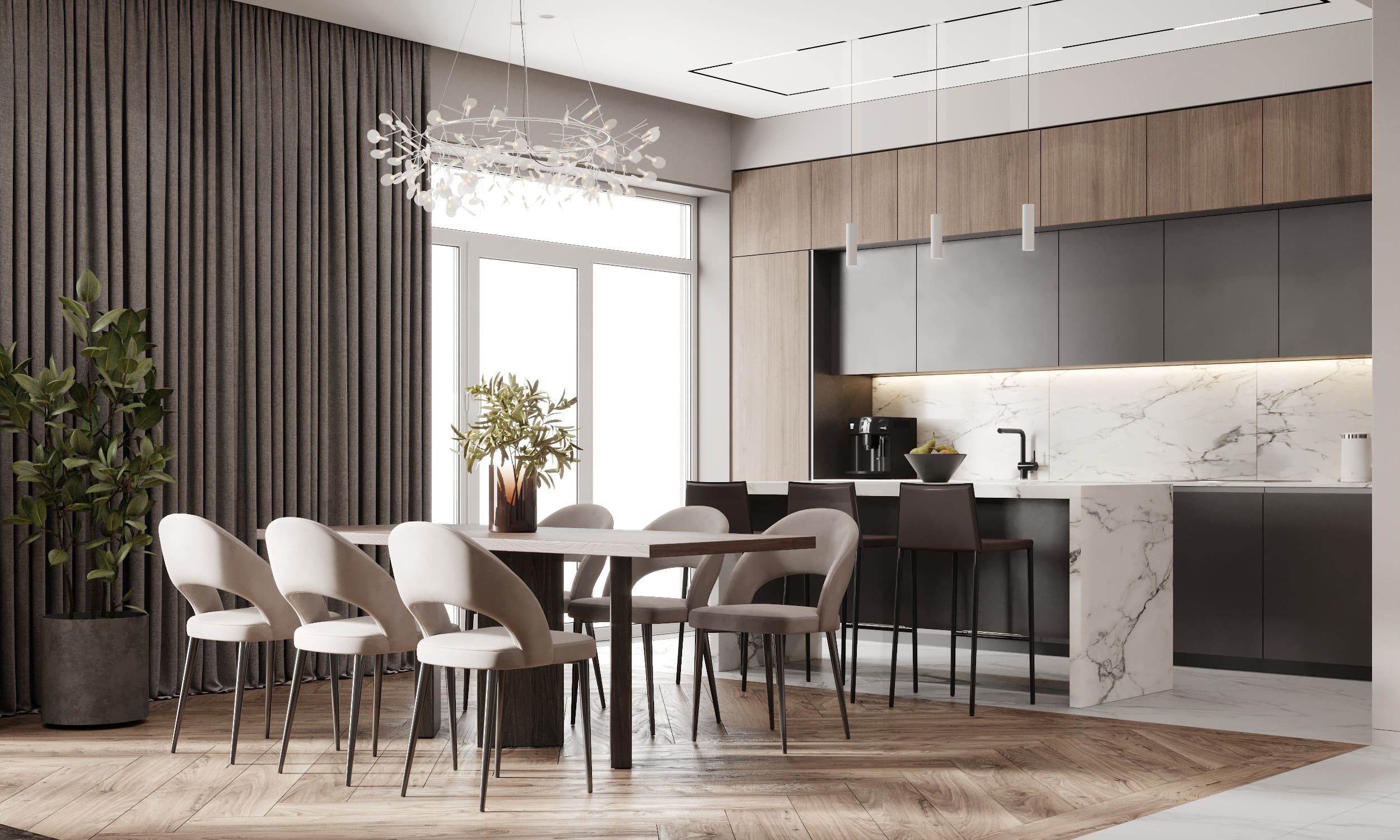Центральной композицией также является обеденный стол с мягкими стульями и стильной люстрой, форма которой напоминает листья деревьев. А панорамное остекление стирает границы между природой и интерьером. Атмосфера спокойствия, тепла и уединения гарантирована.
