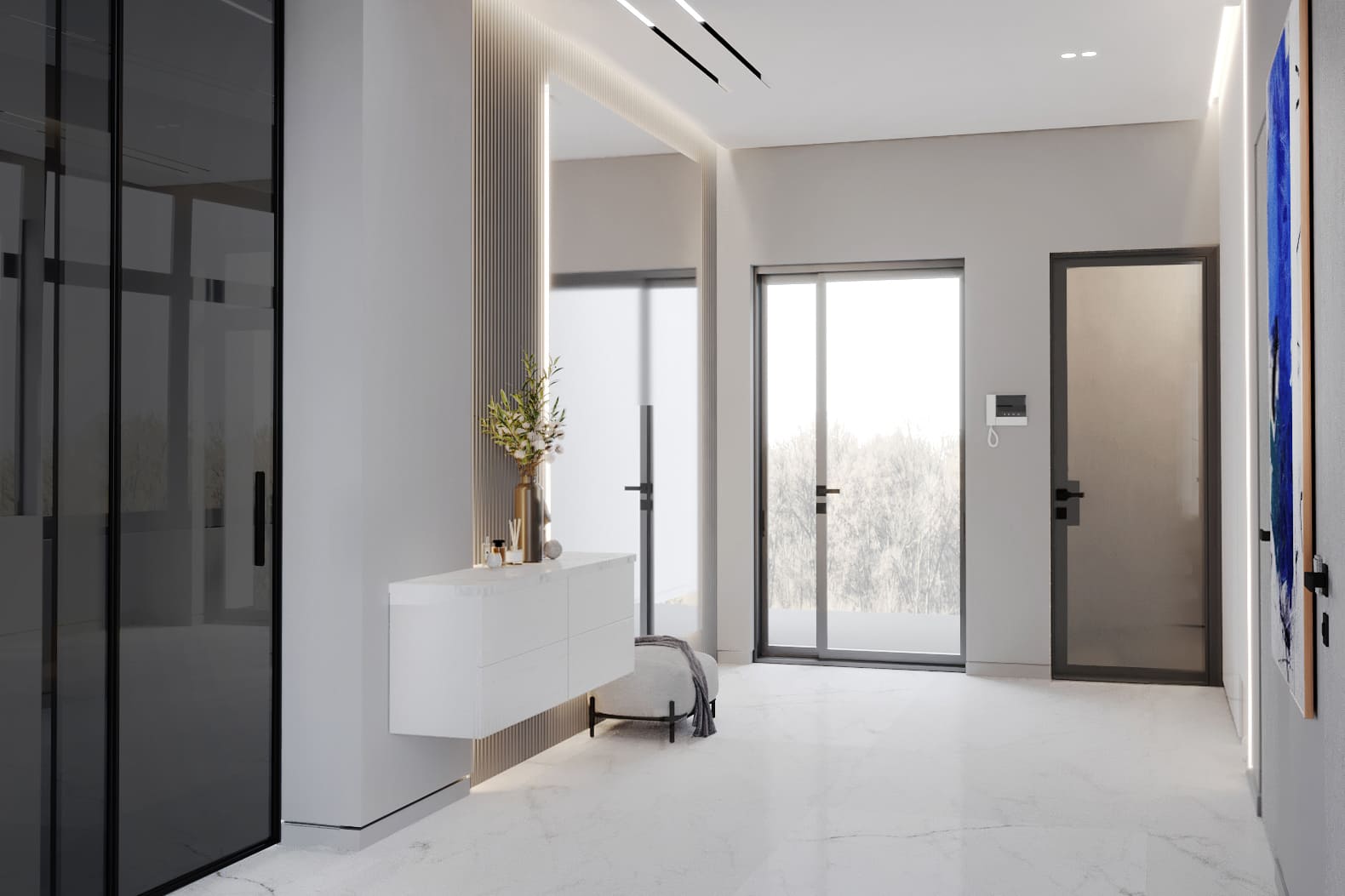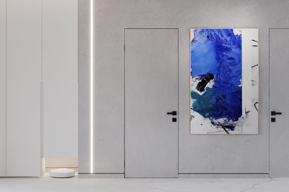 В главной комнате, в гостиной, мы предусмотрели открытие штор и рулонных штор на электрокарнизе. В центре помещения располагается большой модульный диван и ТВ. ТВ-зону решили интересно обыграть 3D панелями со встроенной подсветкой.
