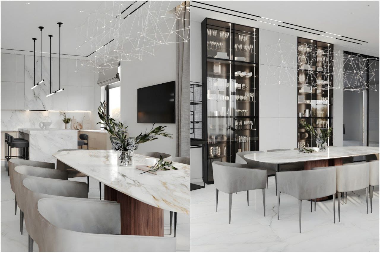 Из гостиной переход на 2-ой этаж по лестнице, которая получилась невесомой, воздушной и парящей. Стену за ней мы решили сделать из каменного шпона со вставками световых линий. Благодаря камню зона лестницы выглядит благороднее и роскошнее.