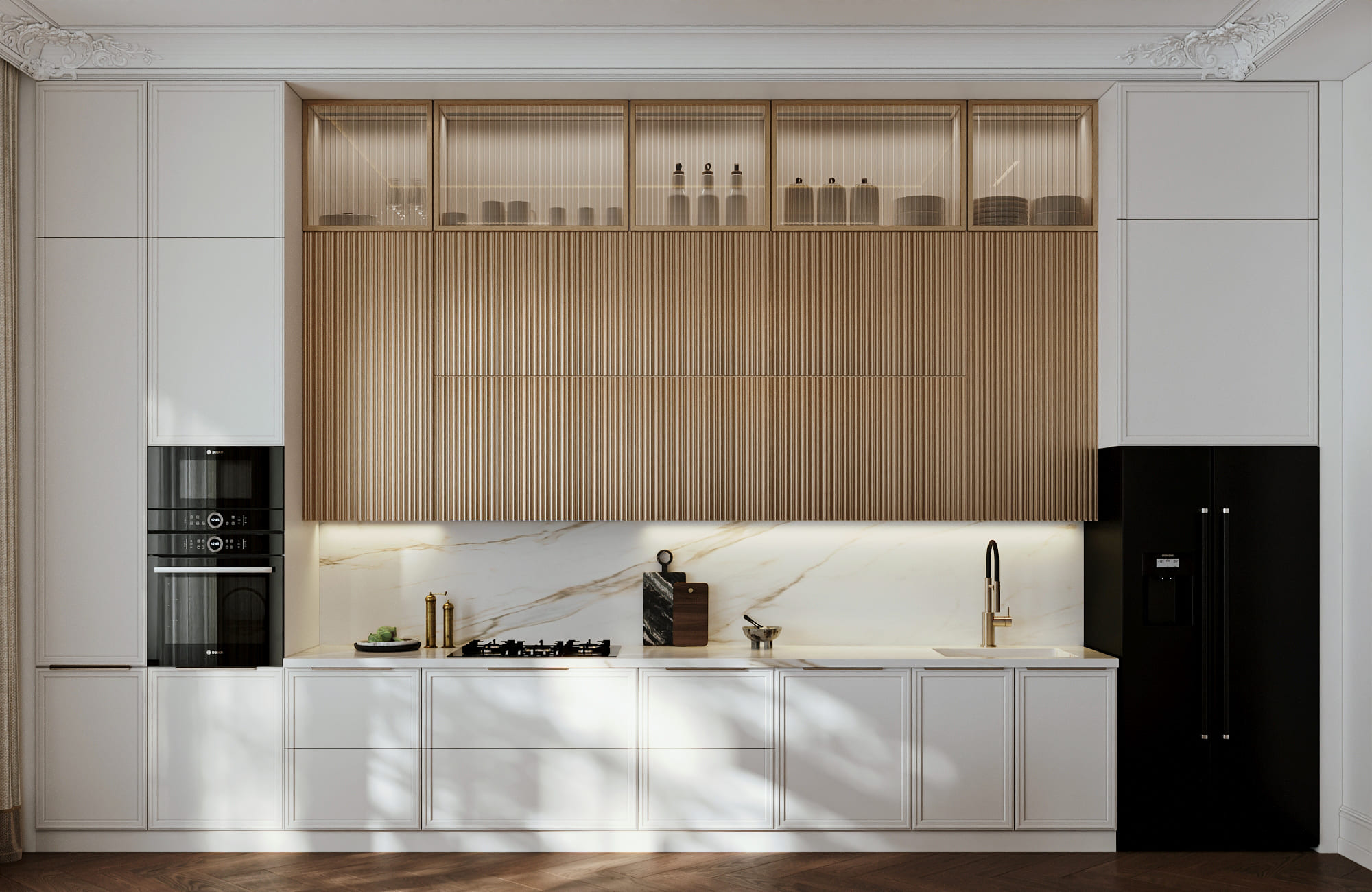 Интерьер выдержан в сдержанной цветовой гамме — белый, теплые древесные тона, золотые акценты, черные элементы техники и декора. Всё это создает ощущение дорогого, но уютного современного пространства, которое органично объединяет кухню, столовую и гостиную.