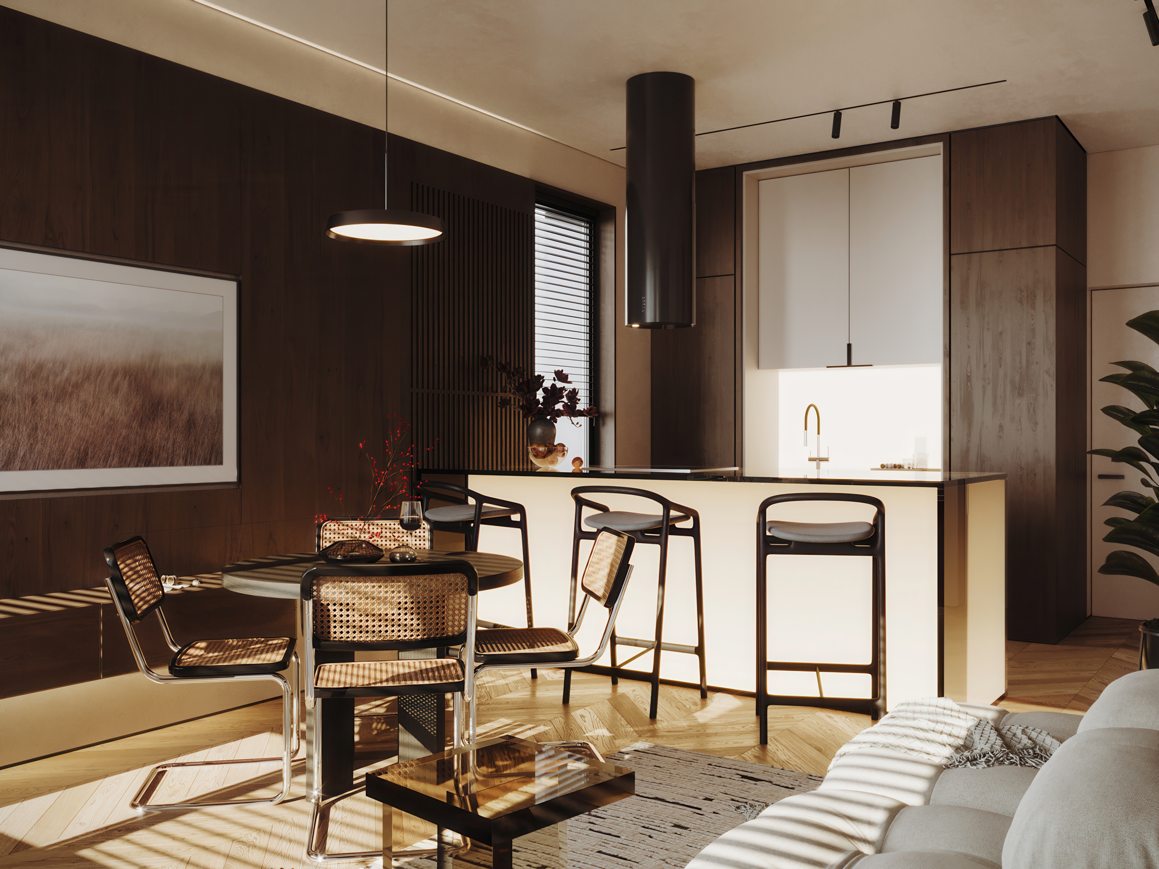 Центром композиции стал остров с мягкой подсветкой, наполняющей пространство теплом. Лаконичные барные стулья на металлических опорах поддерживают визуальную лёгкость и воздушность интерьера. Пол выложен паркетом «ёлочкой» из натурального дуба, который задаёт ритм и добавляет пространству графичности.