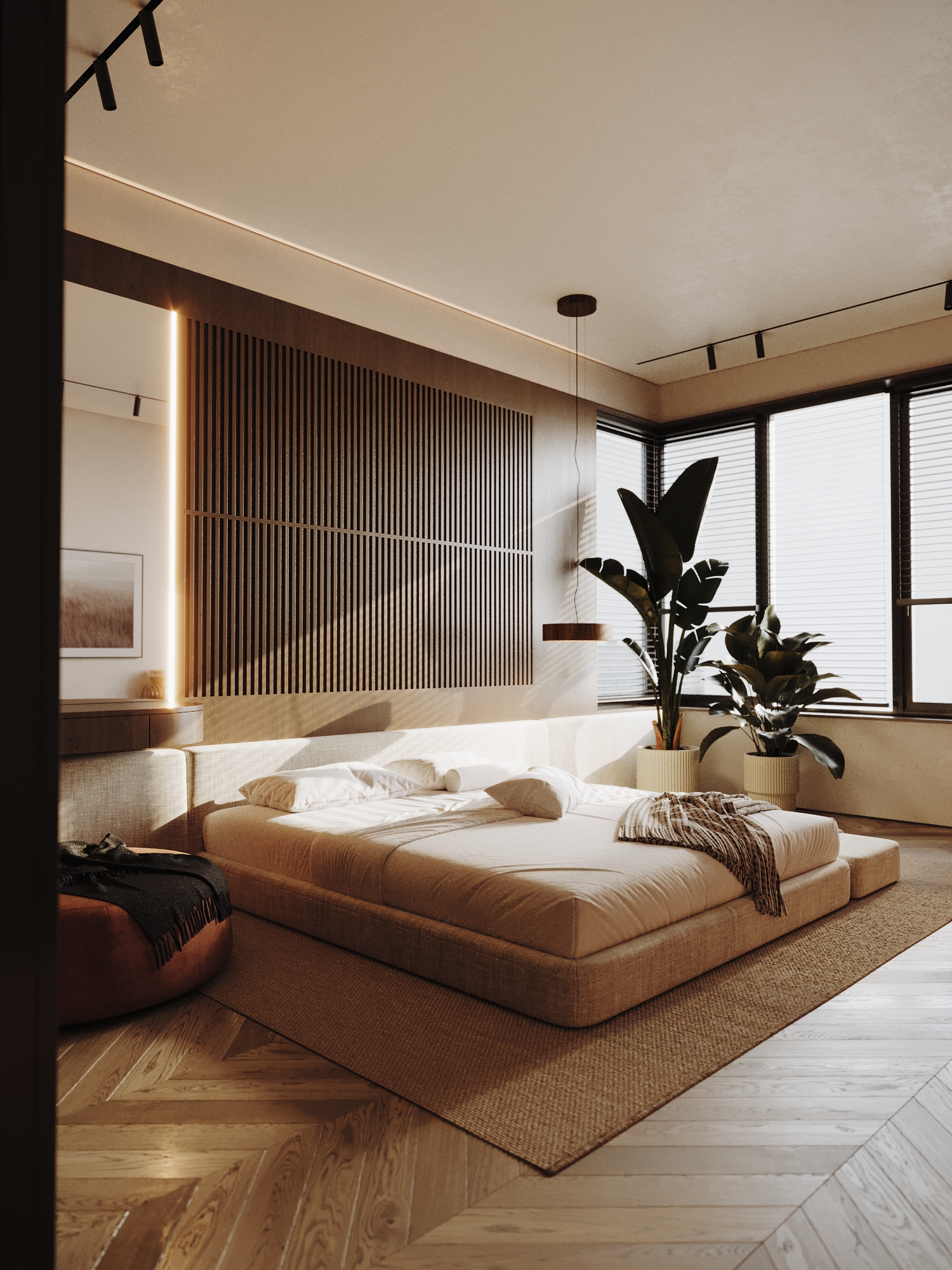В гостевой зоне расположен мягкий диван с округлыми формами в бежево-песочной обивке. Он создаёт уютный акцент на фоне строгих линий мебели. Стены украшены деревянными рейчатыми панелями и крупноформатной картиной с тёплым графичным сюжетом, придающей интерьеру индивидуальность и эмоциональную глубину.